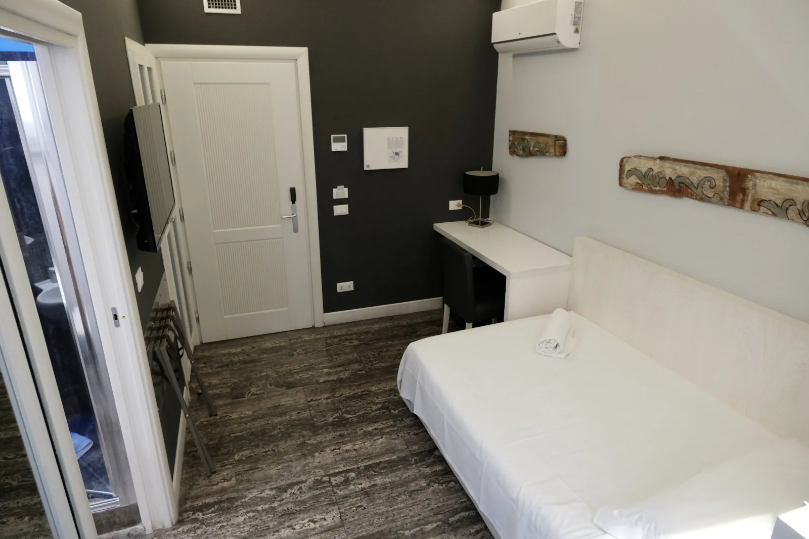 La stanza รจ dotata di un comodo letto alla francese (140x190 cm), ideale per garantire un riposo rigenerante in totale tranquillitร . Il bagno privato, completo di ampio box doccia, asciugacapelli e set di cortesia, รจ progettato per offrire il massimo del comfort durante il soggiorno. Perfetta per chi cerca funzionalitร senza rinunciare allโeleganza, la soluzione Solo Travel rappresenta lโequilibrio ideale tra lavoro e relax.